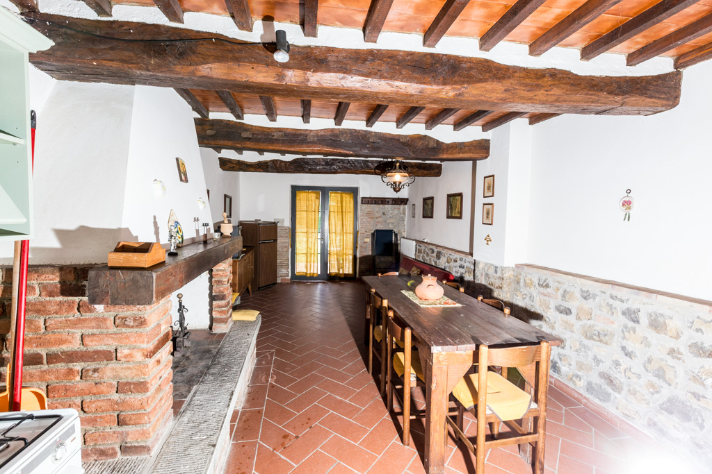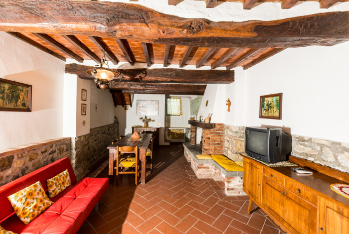 Piano terra: soggiorno con caminetto, cucina con angolo cottura completamente attrezzato (frigorifero, piano cottura e forno).