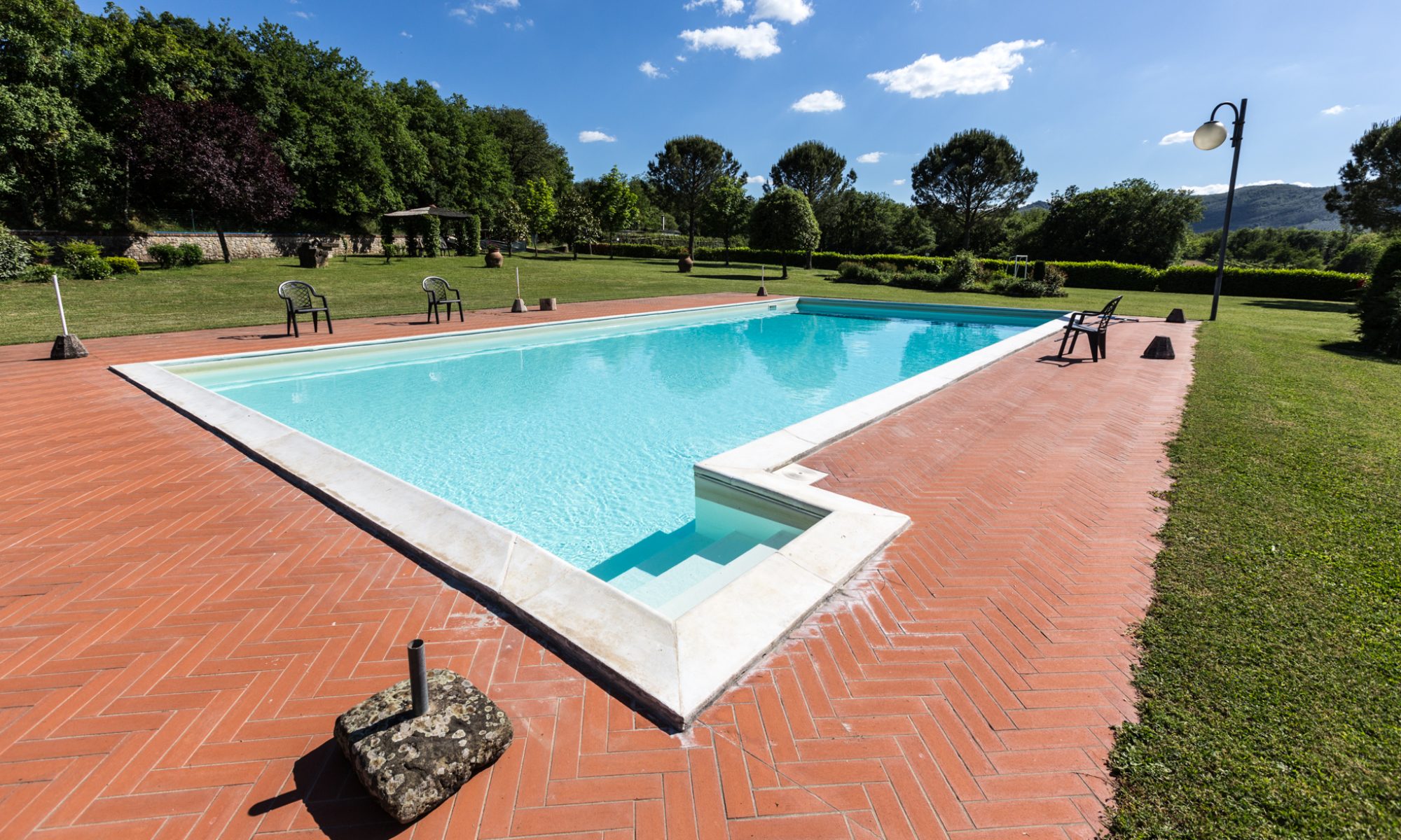 La proprietà è completamente ristrutturata, comprende un grande parco, una bella piscina (di mt. 7,0 x 15), una spaziosa area coperta con tavoli per mangiare all’aperto, ed un campo da tennis.